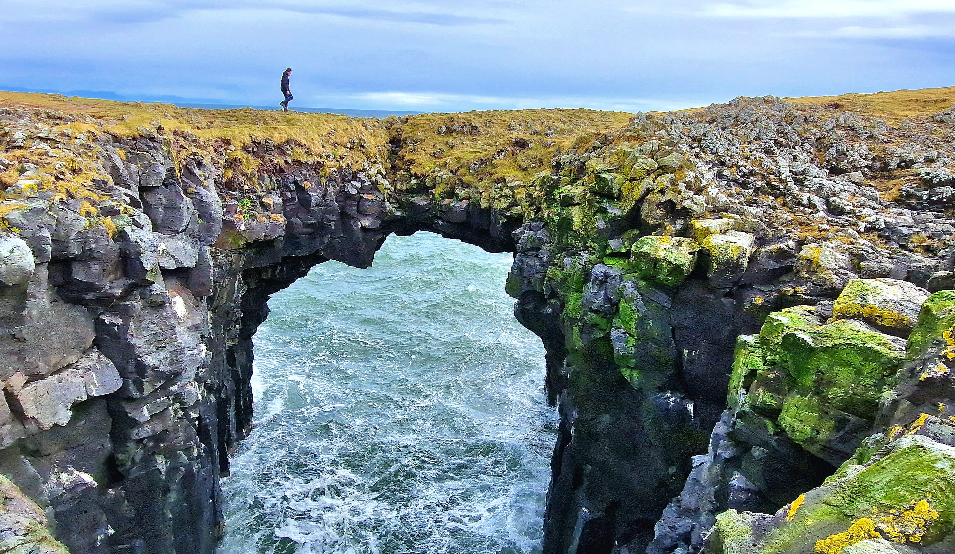 The adventure begins at the charming hamlet of Búðir. Here, remnants of the old fishing village linger, marked by a quaint church and graveyard that offer picturesque views perfect for photography. Next, we visit the small fishing village of Arnarstapi. Known for its charming port, Arnarstapi is home to the stunning Gatklettur (Hellnar Arch), a natural arch sculpted by the sea's relentless force. Towering above the village is Mt. Stapafell, a palagonitic pyramid that adds to the town's scenic beauty.